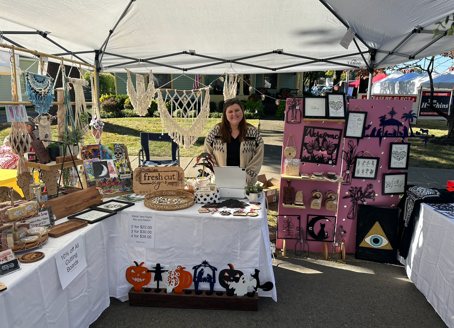 I wasn’t really sure what to do next, but I knew that I had always dreamed of someday owning my own business. I bought a Glowforge laser around Thanksgiving 2021, on a whim. A week after buying the laser, with some encouragement from friends and family, I found myself at the St. Gregory Christmas Craft Show, showcasing what I had made so far. The response was overwhelmingly positive, and I knew that I wanted to continue to explore this medium. So, I decided to start a business, specializing in home decor, personalized signs, clothing, and jewelry.